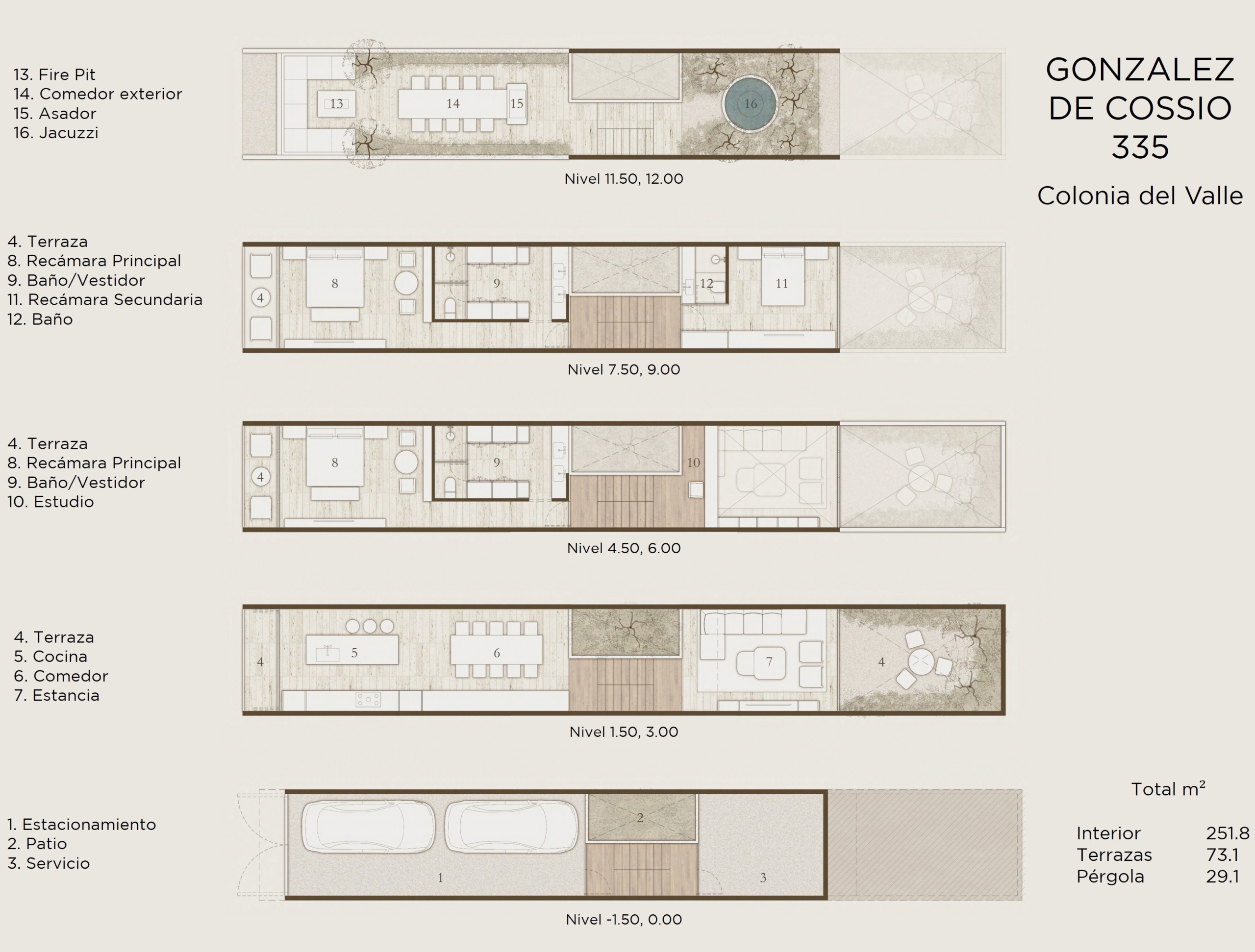 Desarrollo boutique de 4 casas de 251 m² habitables y 354 m² totales, todas con jardín interior privado.
