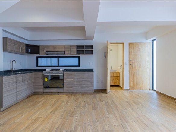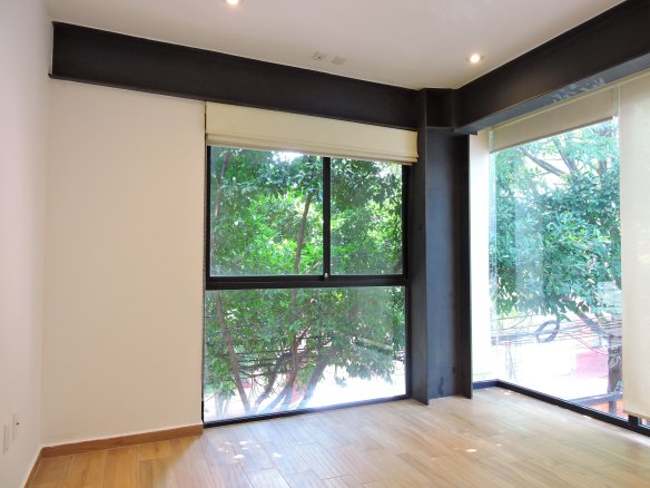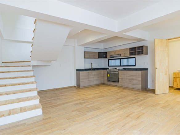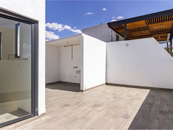 Townhouse exterior de 3 niveles. Sala comedor, cocina equipada, bodega y medio baño para visitas en el nivel de acceso. En el segundo nivel la recámara principal con clóset vestidor y baño propio, y una sala de TV. Dos recámaras secundarias con baño completo compartido en el tercer nivel. Roof garden privado con cuarto de lavado. 117 m2 habitables, 28 m2 libres. 2 lugares de estacionamiento.