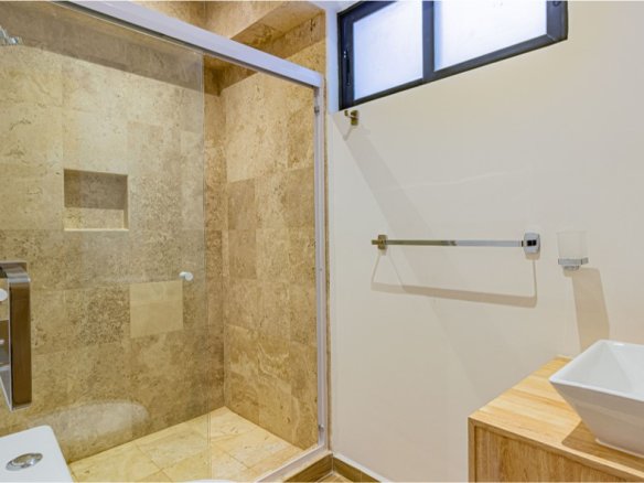 Townhouse interior de 3 niveles. Sala comedor, cocina equipada, bodega y medio baño para visitas en el nivel de acceso. En el segundo nivel la recámara principal con clóset vestidor y baño propio, y una sala de TV. Dos recámaras secundarias con baño completo compartido en el tercer nivel. Roof garden privado con cuarto de lavado. 116 m2 habitables, 28 m2 libres. 2 lugares de estacionamiento.