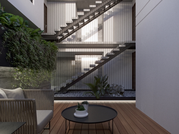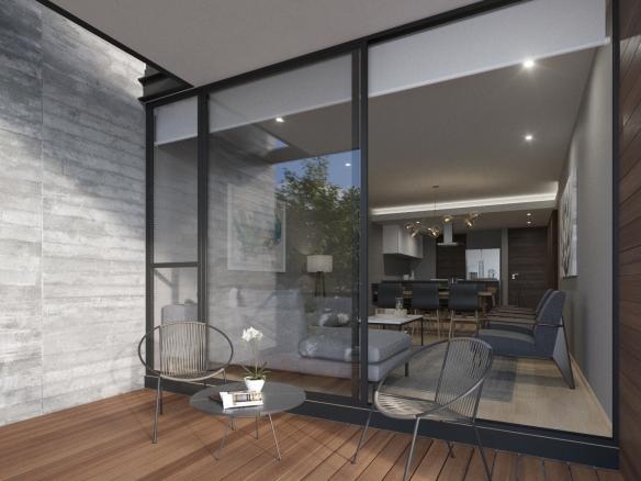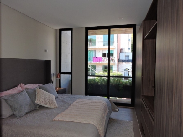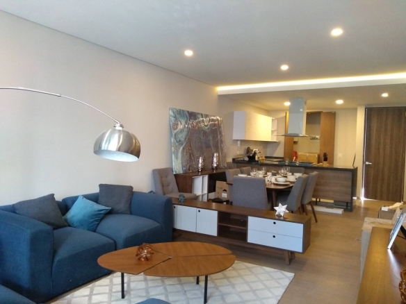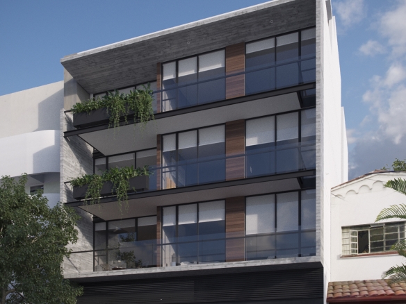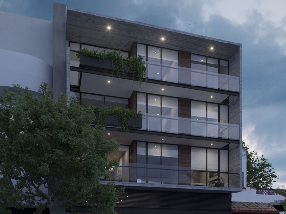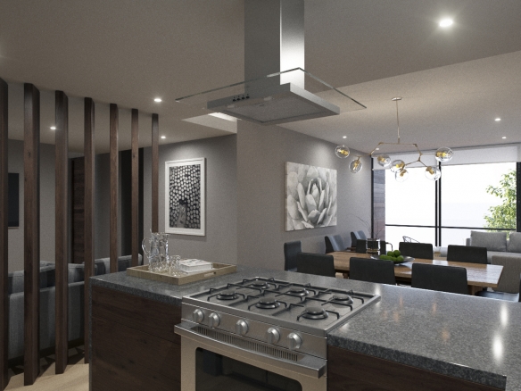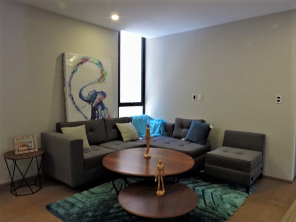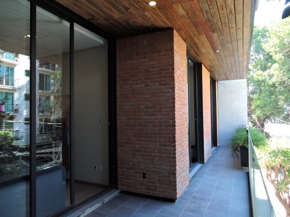 Departamento interior de un nivel en tercer piso, 3 habitaciones, 4 baños completos, sala, comedor y cocina. Cuarto de lavado, cuarta habitación o family room, 2 cajones de estacionamiento y bodega. 192 m2 habitables, 13.5 de balcón y 44 m2 de roof garden privado.