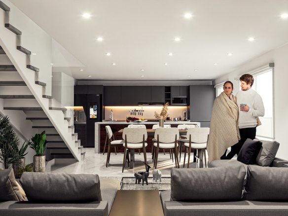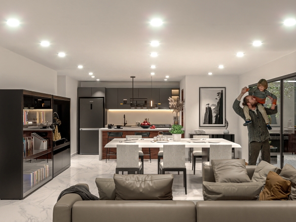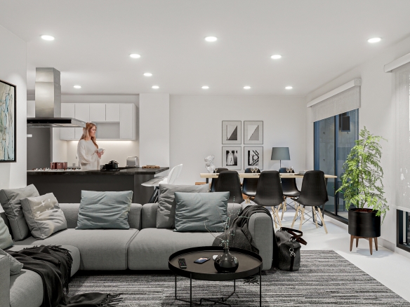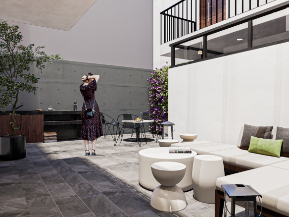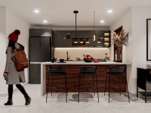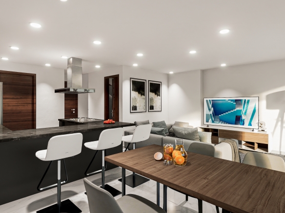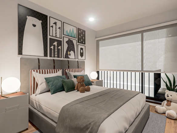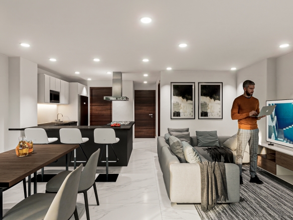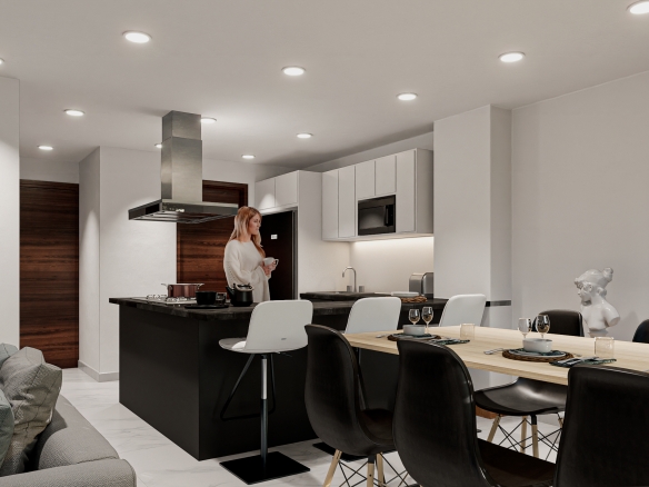 Departamentos de entre 65 m 2 y 127 m 2 interiores, todas las unidades cuentan con terraza y/o balcón. Espacios abiertos en áreas de circulación. Recepción y sala de bienvenida, elevador y amplio estacionamiento subterráneo.
